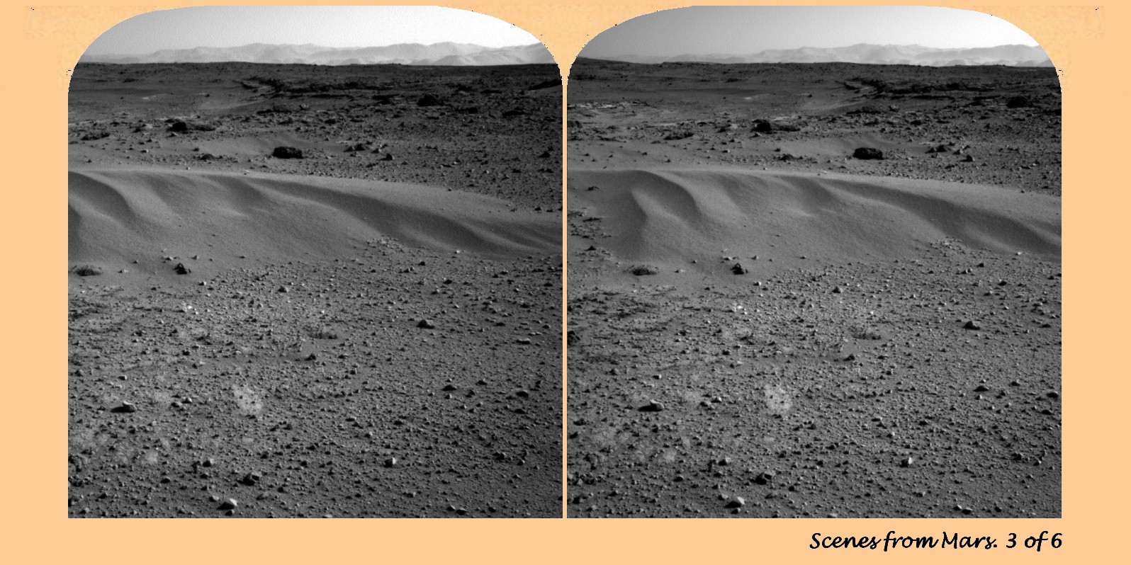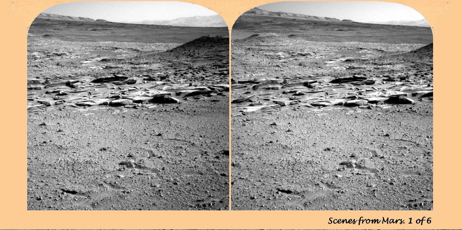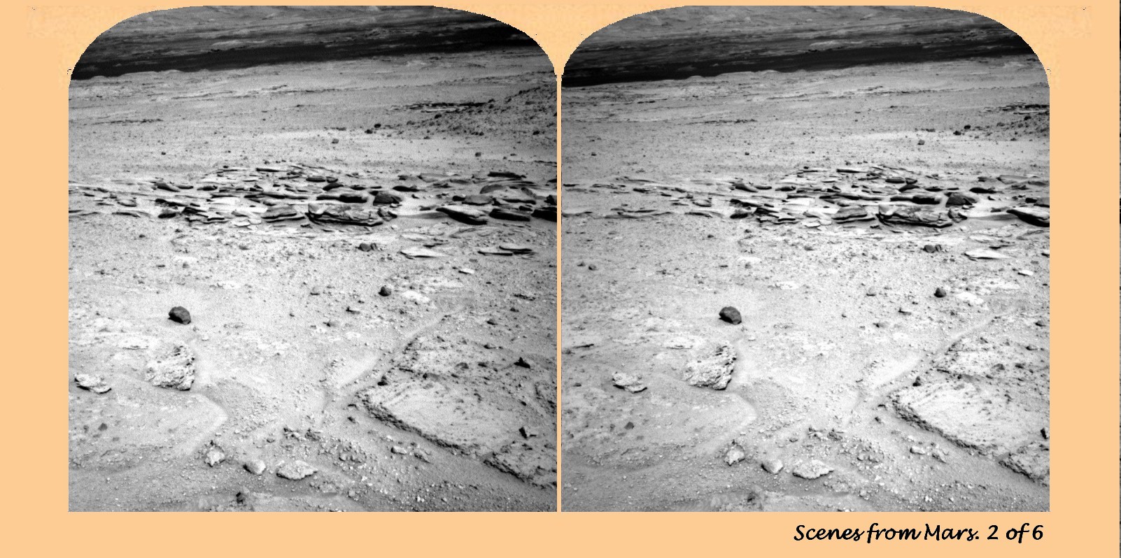 If you have a Stereograph of the sort used in Victorian times for stereo viewing, you may download these images, print them and view them to see Mars in three dimensions. The images are in black-and-white Curiosity's nav cam is monochrome), but they are nonetheless striking -- both familiar and alien at the same time.