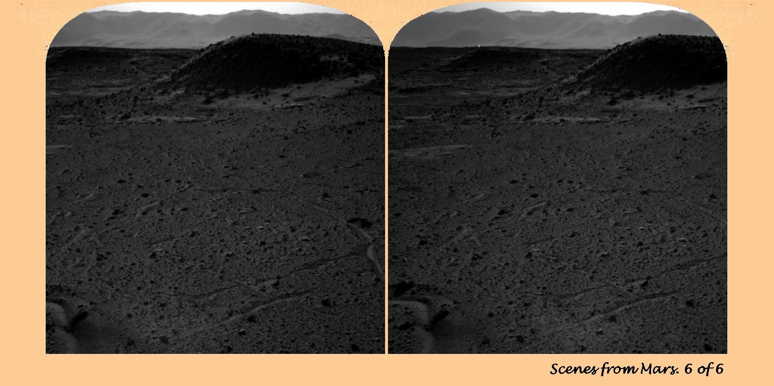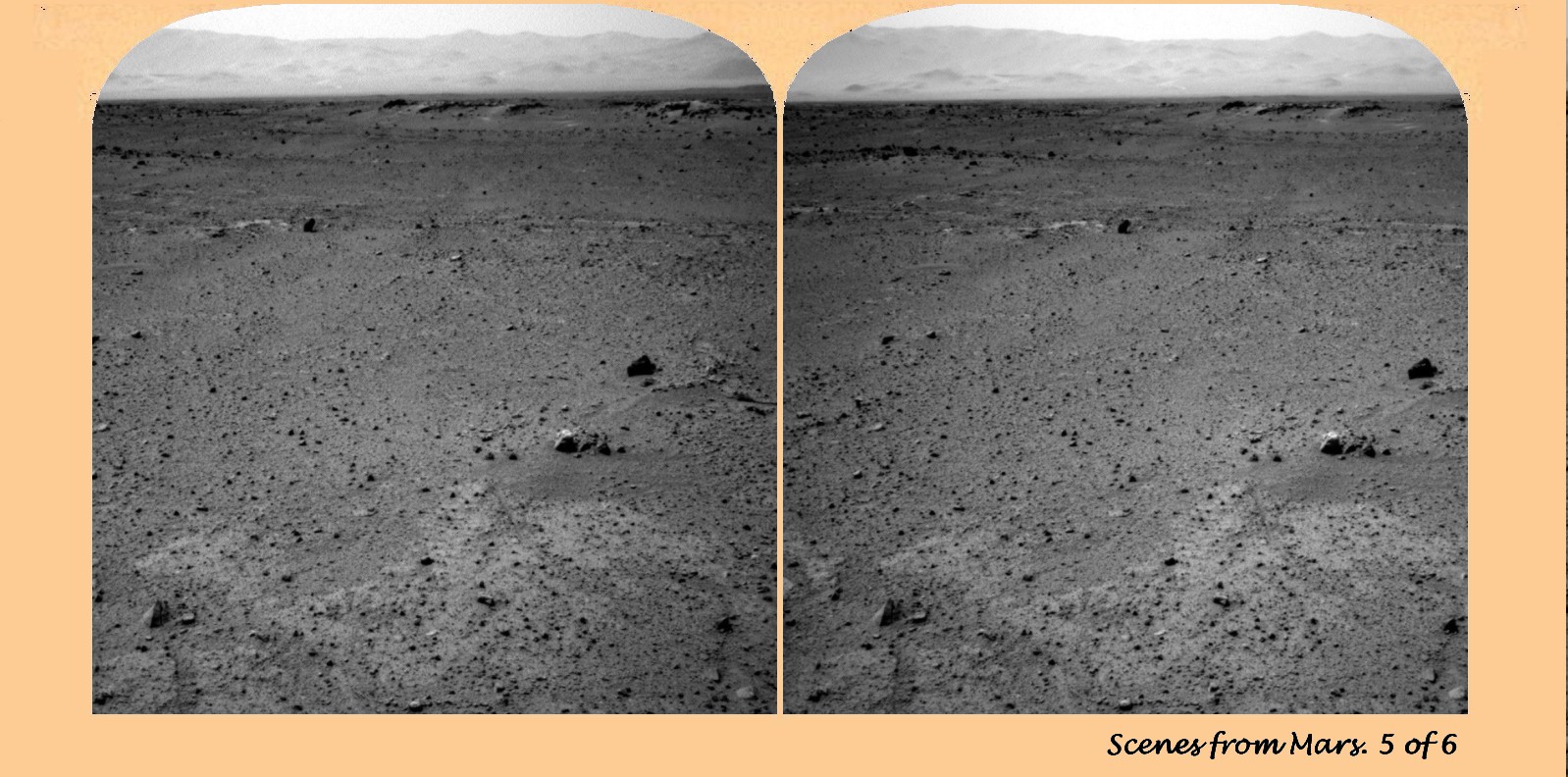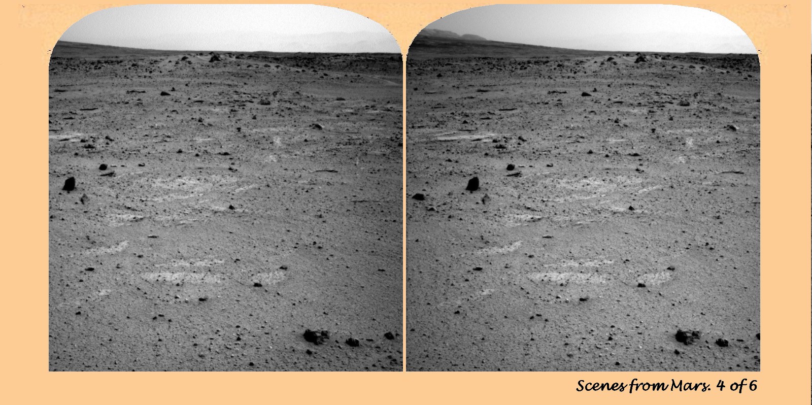 If you have a Stereograph of the sort used in Victorian times for stereo viewing, you may download these images, print them and view them to see Mars in three dimensions. The images are in black-and-white Curiosity's nav cam is monochrome), but they are nonetheless striking -- both familiar and alien at the same time.